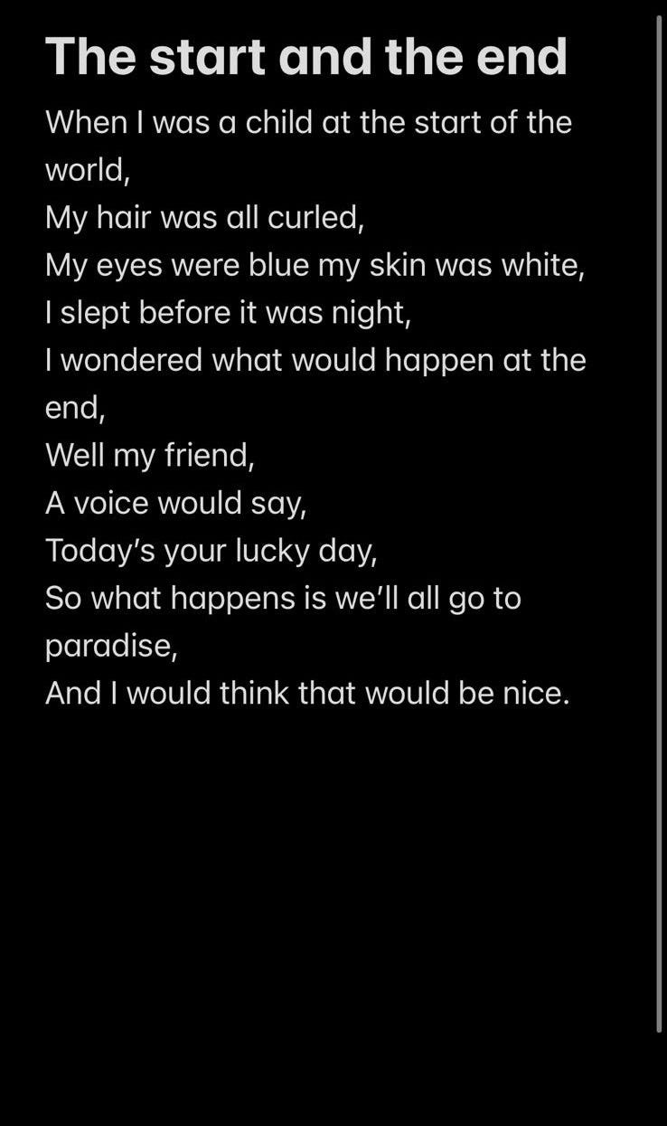The start and the end of "The Start and the End" ie. The first and last lines, are phenomenal. I can't believe she's 8. Awe/wonder inspiring ✨️ 💕